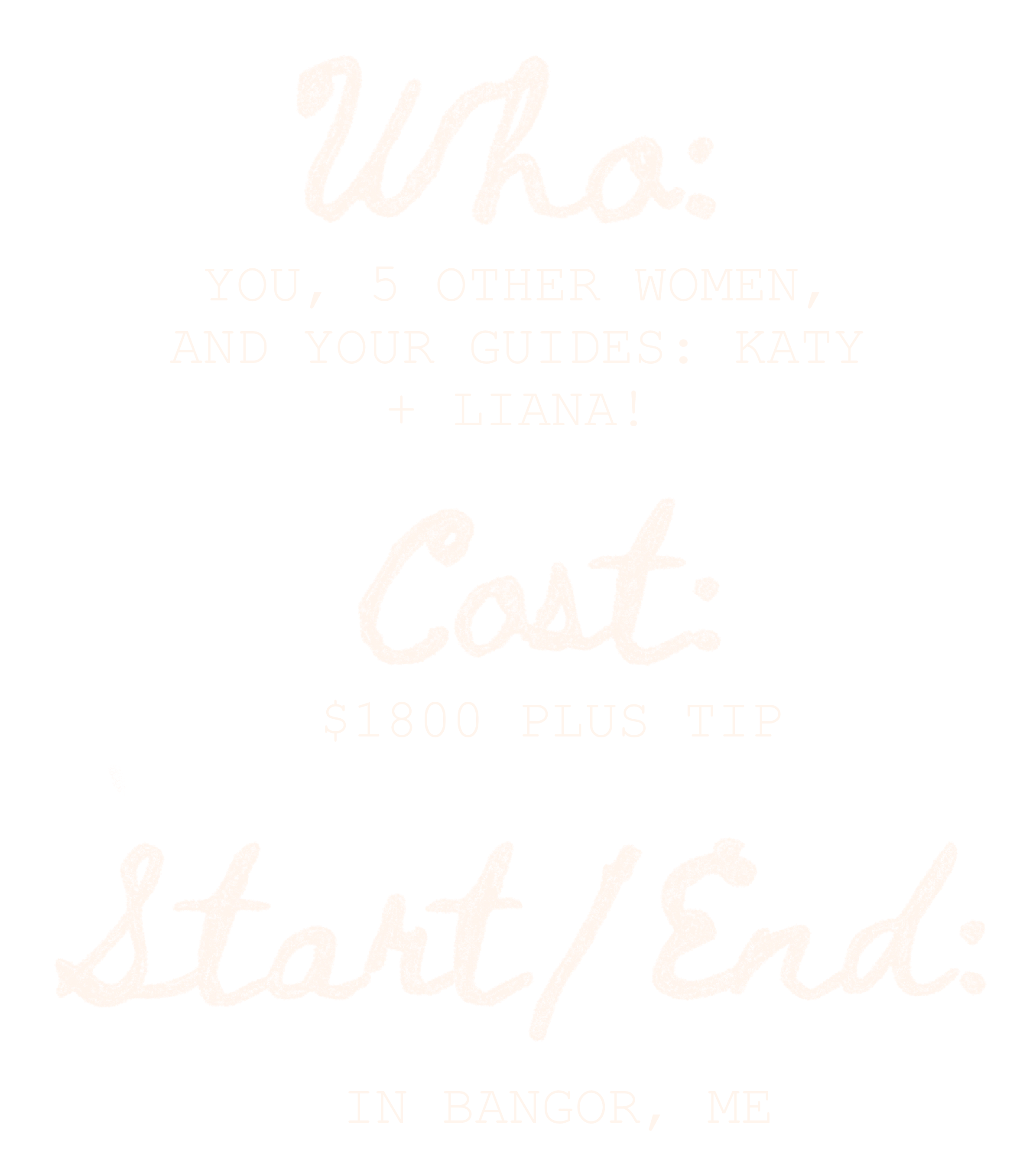- guide services - canoes, paddles, pfds - camping fees + permits - all meals + snacks - water filtration - transportation in and out of the woods from bangor, me -tents, large personal dry bags, and sleeping bags, if needed - extensive first aid kid - satellite communication device - safety and rescue equipment - guidance and advice as you pack and prepare for the trip :)
